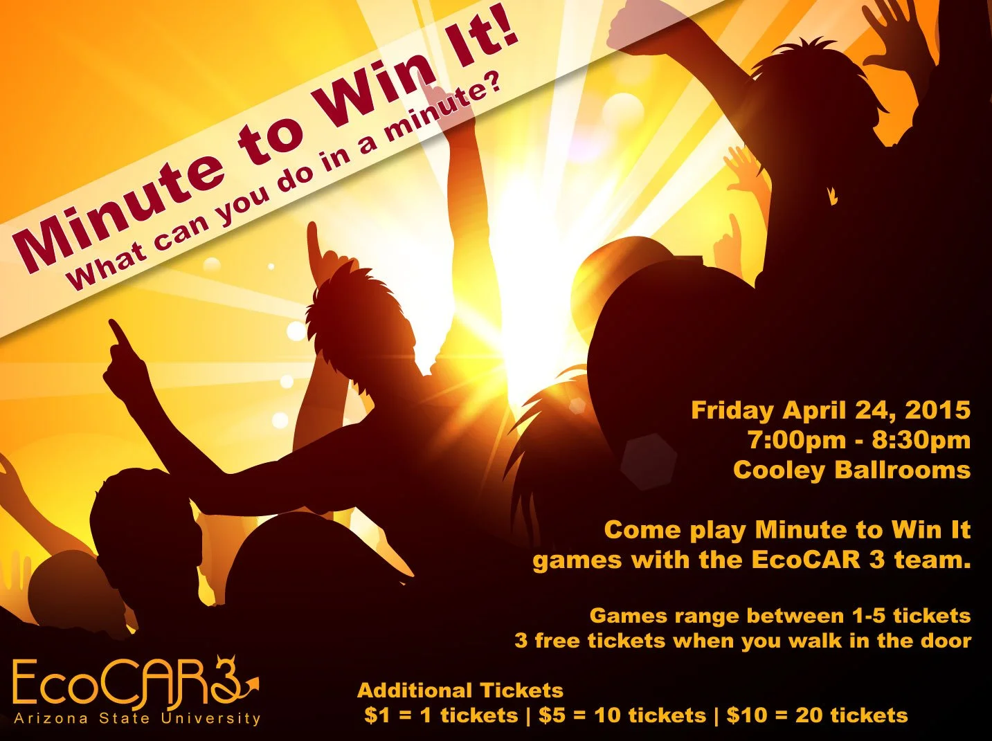 These ads were created for the fall student club outreach event at Arizona State University (ASU) Polytechnic. Various games were setup along the lines of the Minute to Win It game show. The ads were displayed on the event webpage and displays throughout the campus.